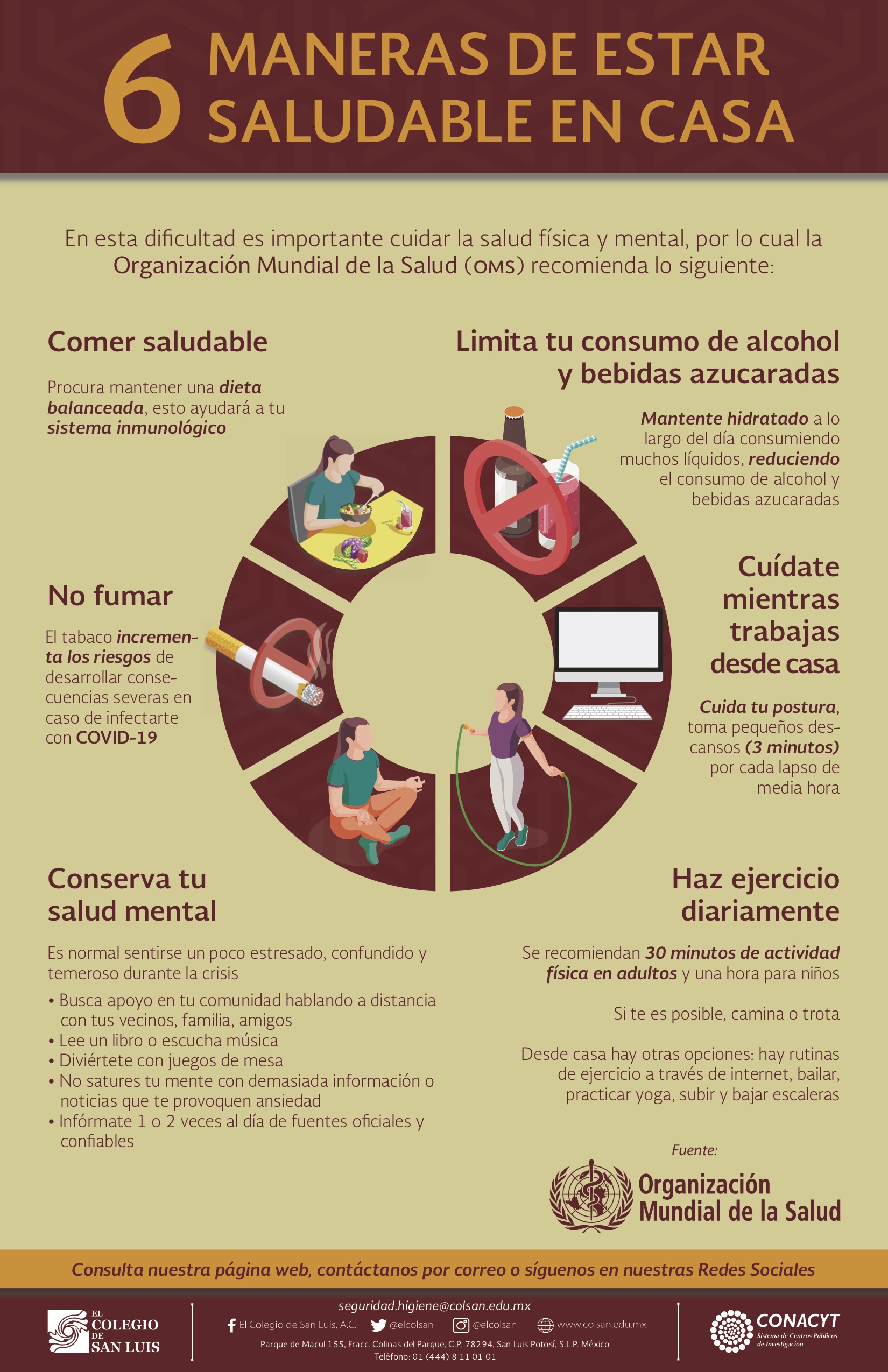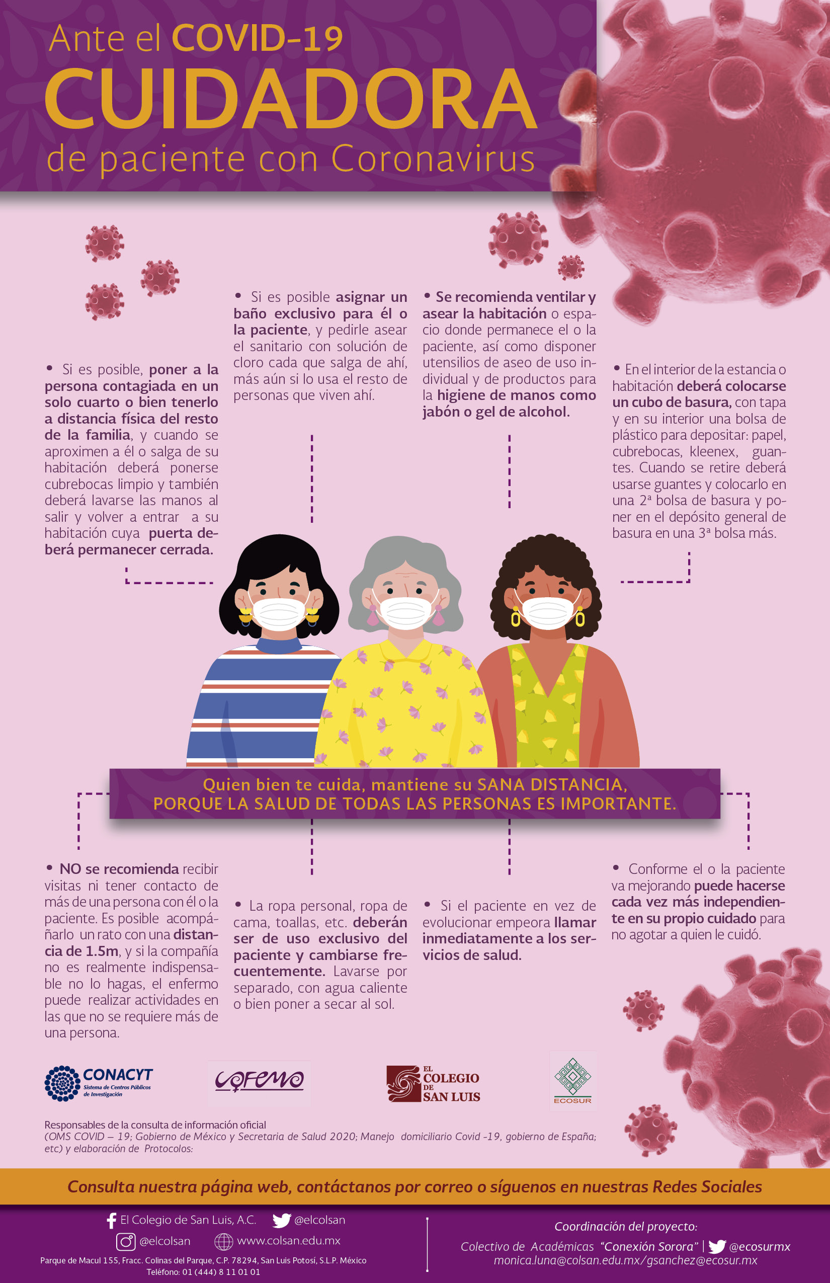 Información preventiva sobre COVID-19 con un enfoque de género y salud para mujeres que desarrolló el Colegio de San Luis (México), el Colectivo Feminista Mercedes Olivera y el Psychiatrische Institutsambulanz Winsen (Alemania). Los contenidos y el diseño son originales de la colectiva Conexión Sororal.